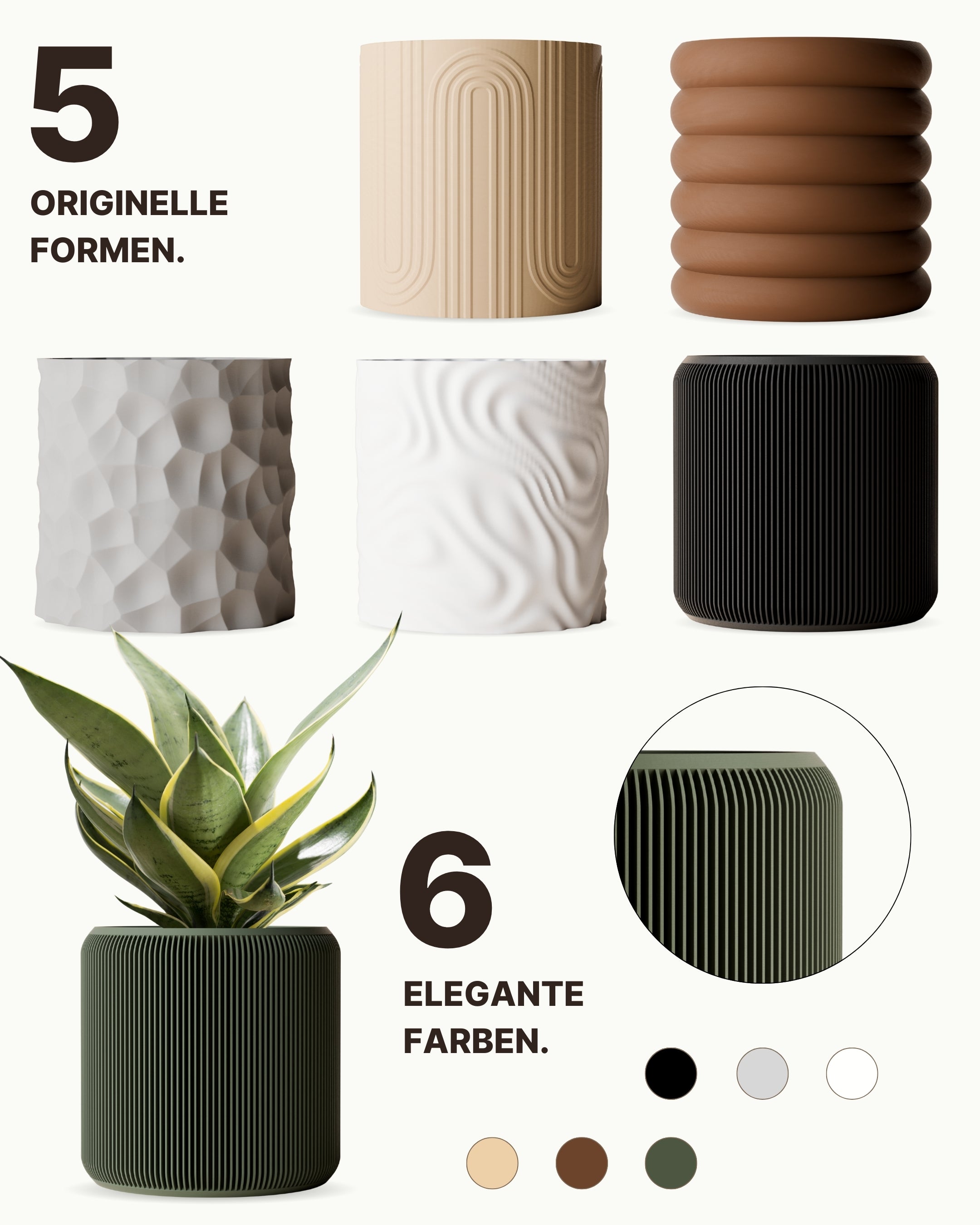 Bereichere dein Portfolio mit verschiedenen Formen, sowie Farben unserer designer Pflanzentöpfe.